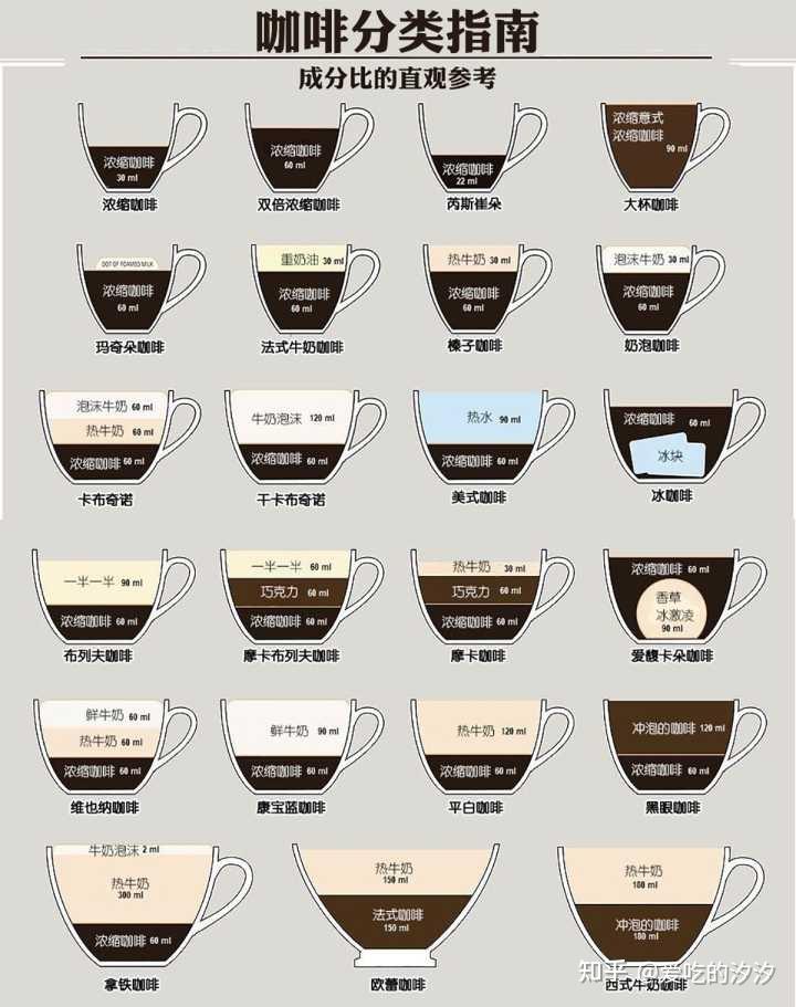 看看,同样一杯浓缩咖啡的底,由于加入了不同比例的奶、糖、奶油等配料,会调配出不同口味的咖啡。