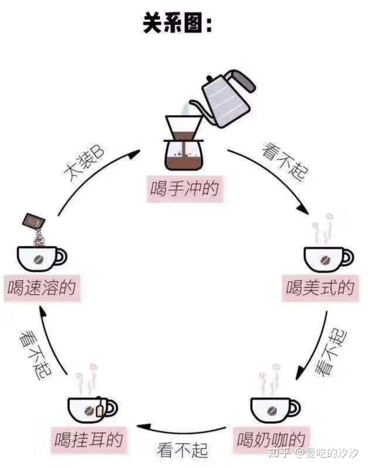 从这张图我们可以看到,在咖啡这个圈子里,充满了"鄙视"的目光~