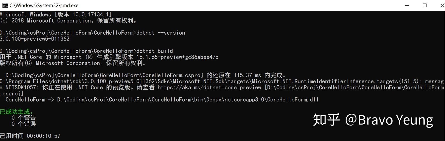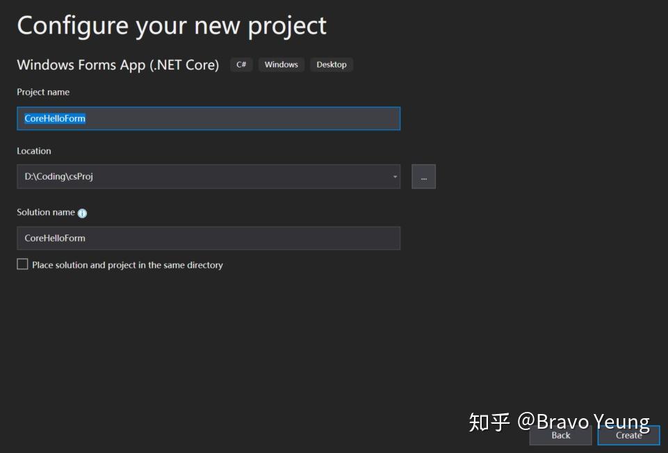 使用vs自带的模板,选择其中的 .net core forms 创建Project, 取名为"CoreHelloForm"