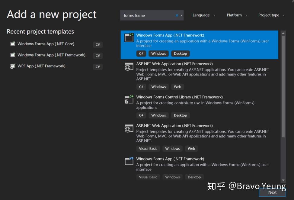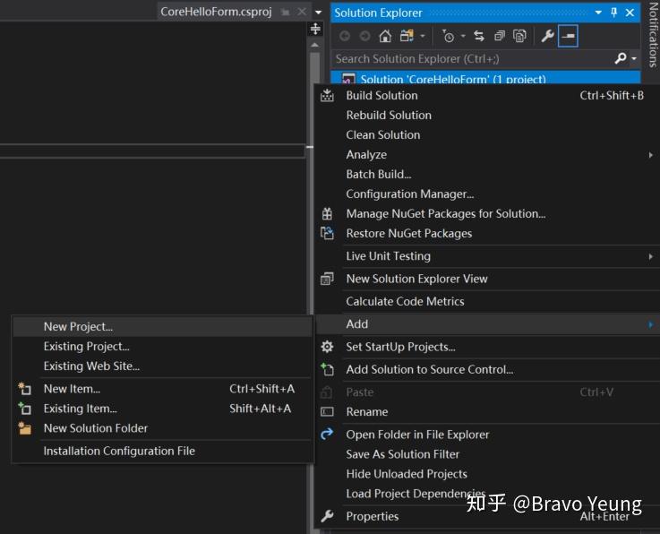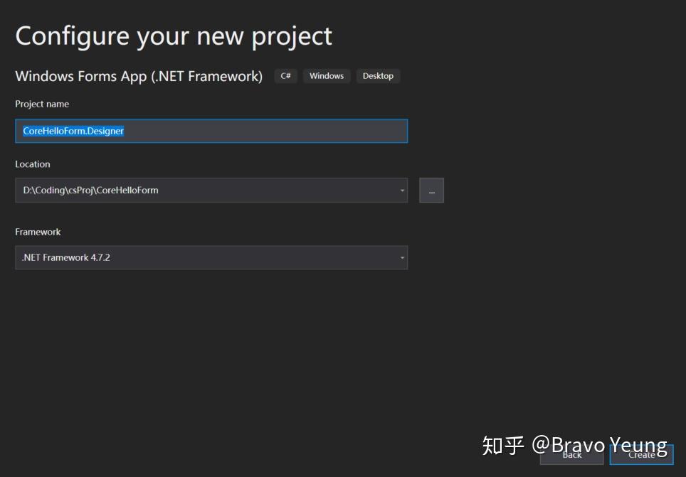在刚创建的Solution中使用vs自带的模板,选择其中的.net framework forms添加新的project,取名为"CoreHelloForm.Designer"