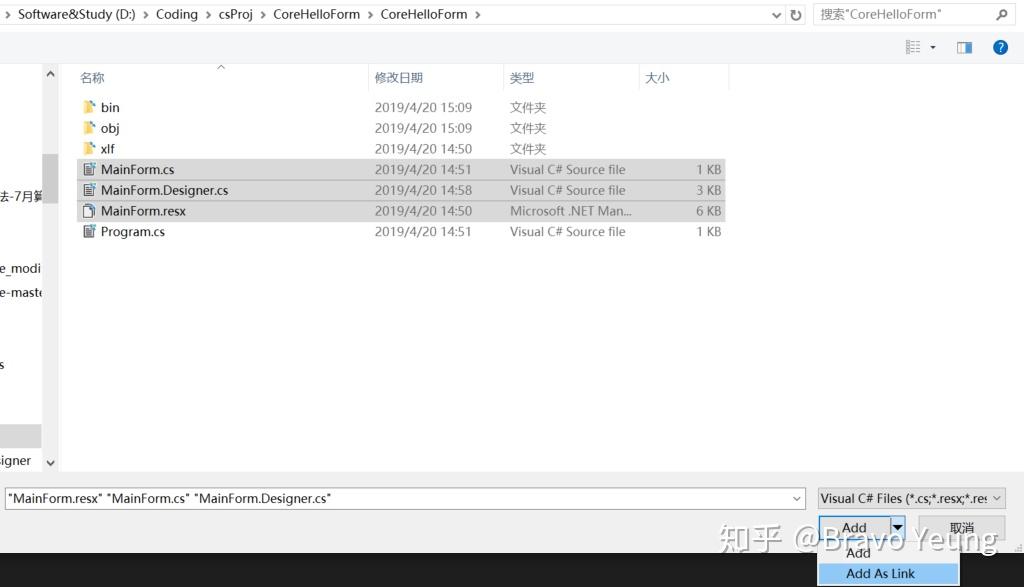 在项目`CoreHelloForm.Designer中以"As Link"的方式引用.net core form项目下的MainForm相关文件
