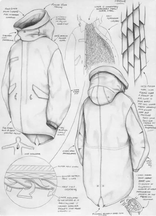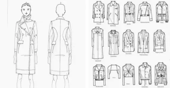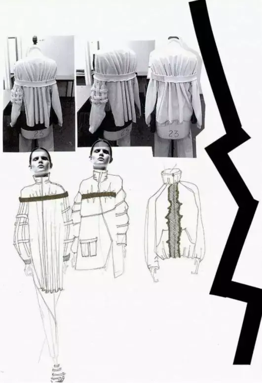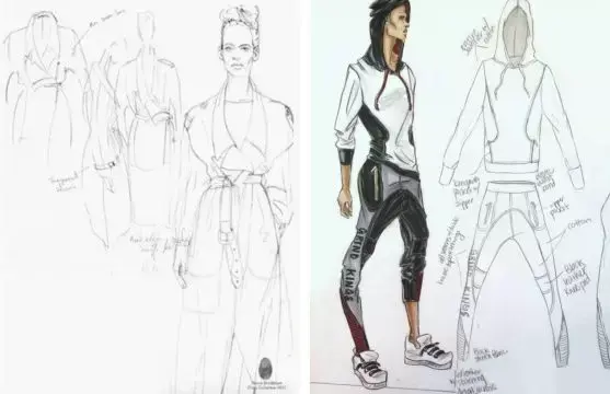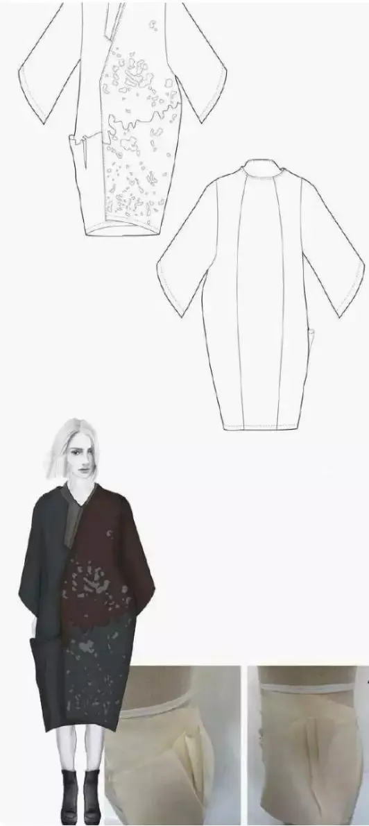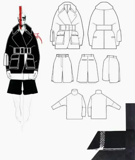 在上面的效果图表现中,我们能看到设计师从线迹、面料部位的不同变化、配料等全部细节被逐一标出,这使得版师与样衣工能一目了然的知道这款衣服该做成什么样。