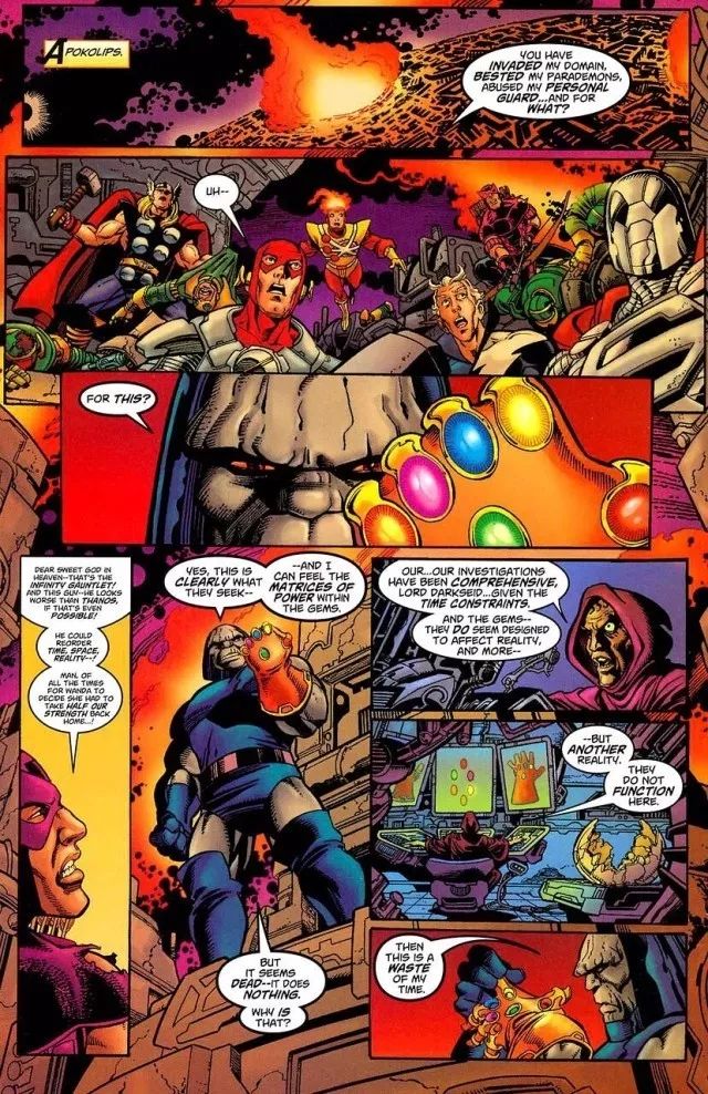 说到对手就更不用提了,在漫画复仇者VS正联中,DC宇宙的大boss达克赛德将戴有无限手套的灭霸轻松击败,抢走了无限手套,然后觉得没用,把无限手套给扔了……扔了……