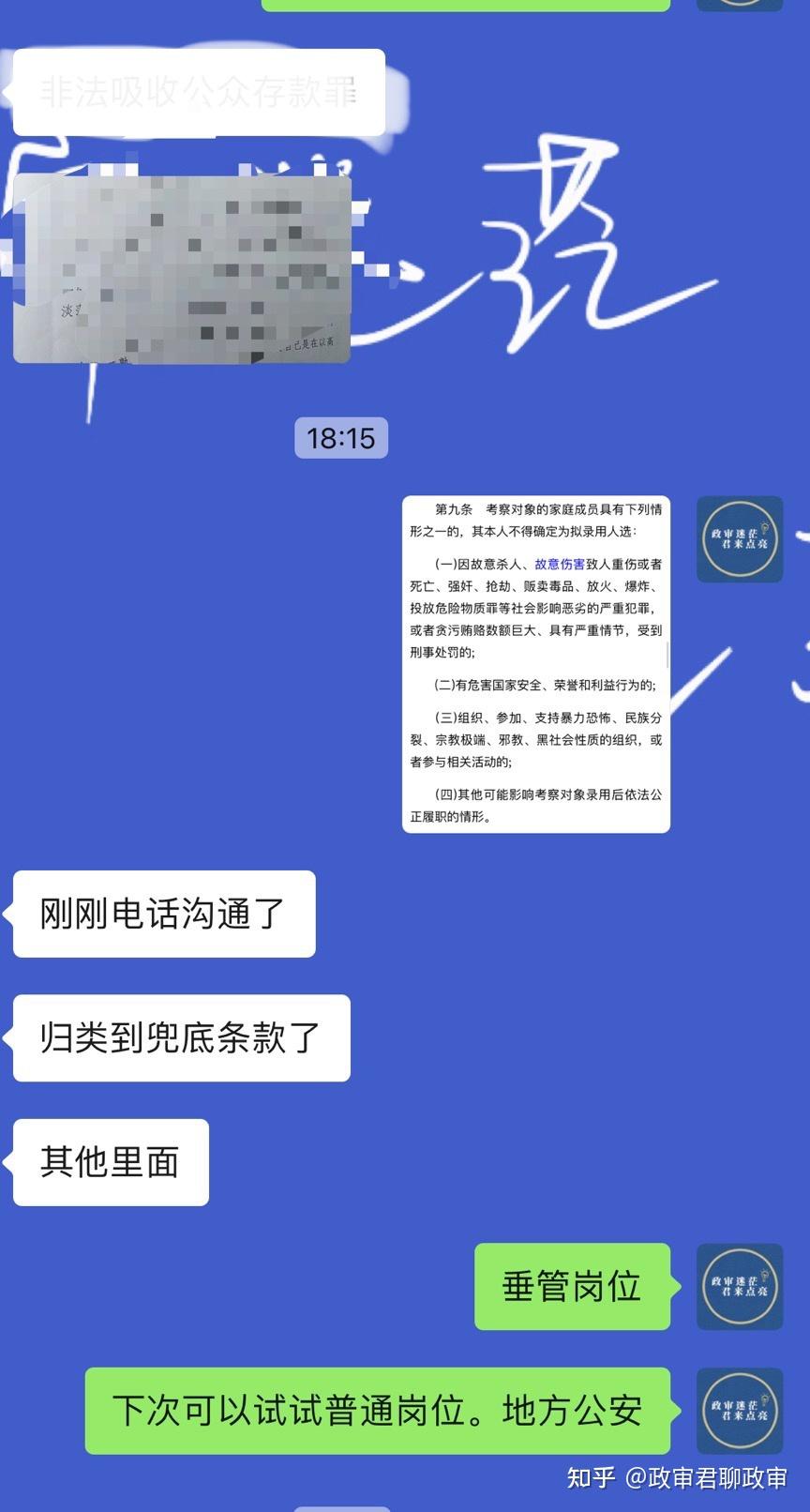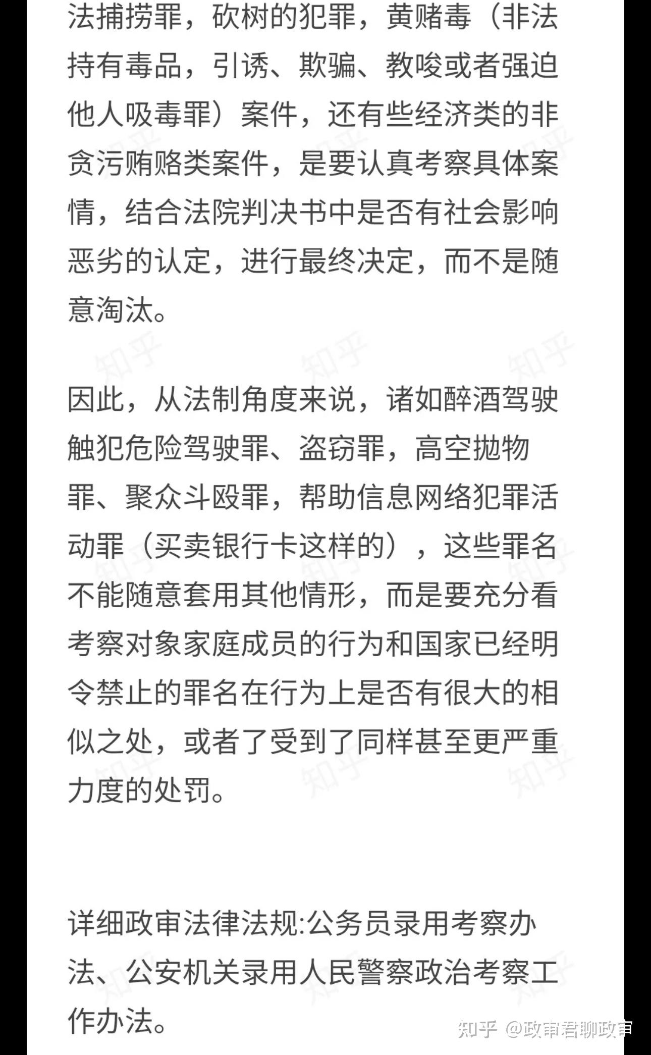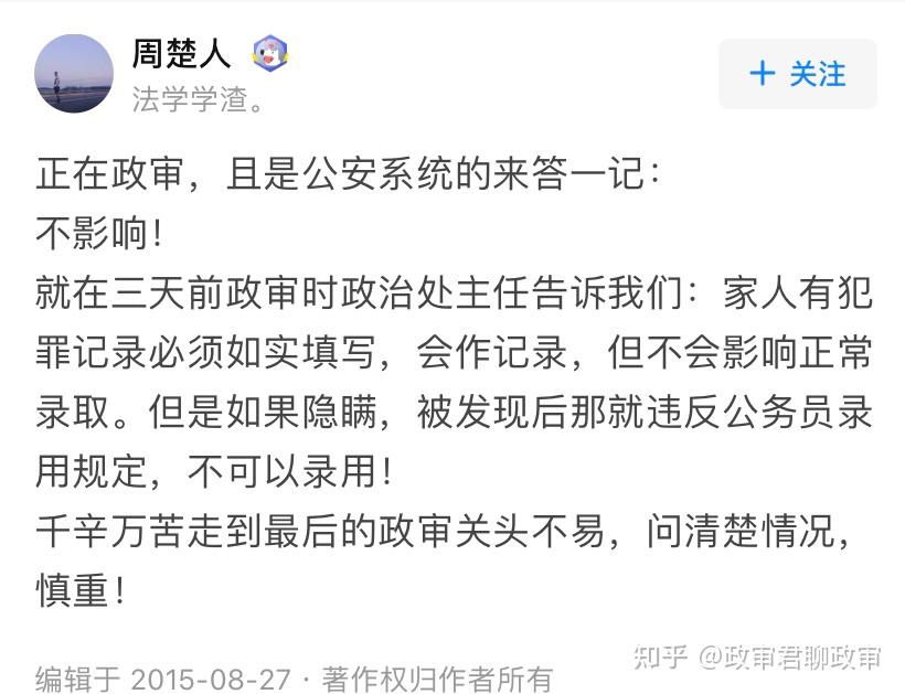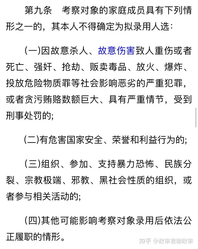 再说一下,那些心态不正。公考考了好几次考不上,或者考上了在单位受气,没有认真研究过政审的可怜虫们。别总拿兜底条款说事儿,别觉着一个兜底条款,别人父母有案底自己的没有我就高人一等了!这不是大清朝,不搞连坐!父母有案底的也保证心态,你们和父母没案底的人在政治上基本一致。