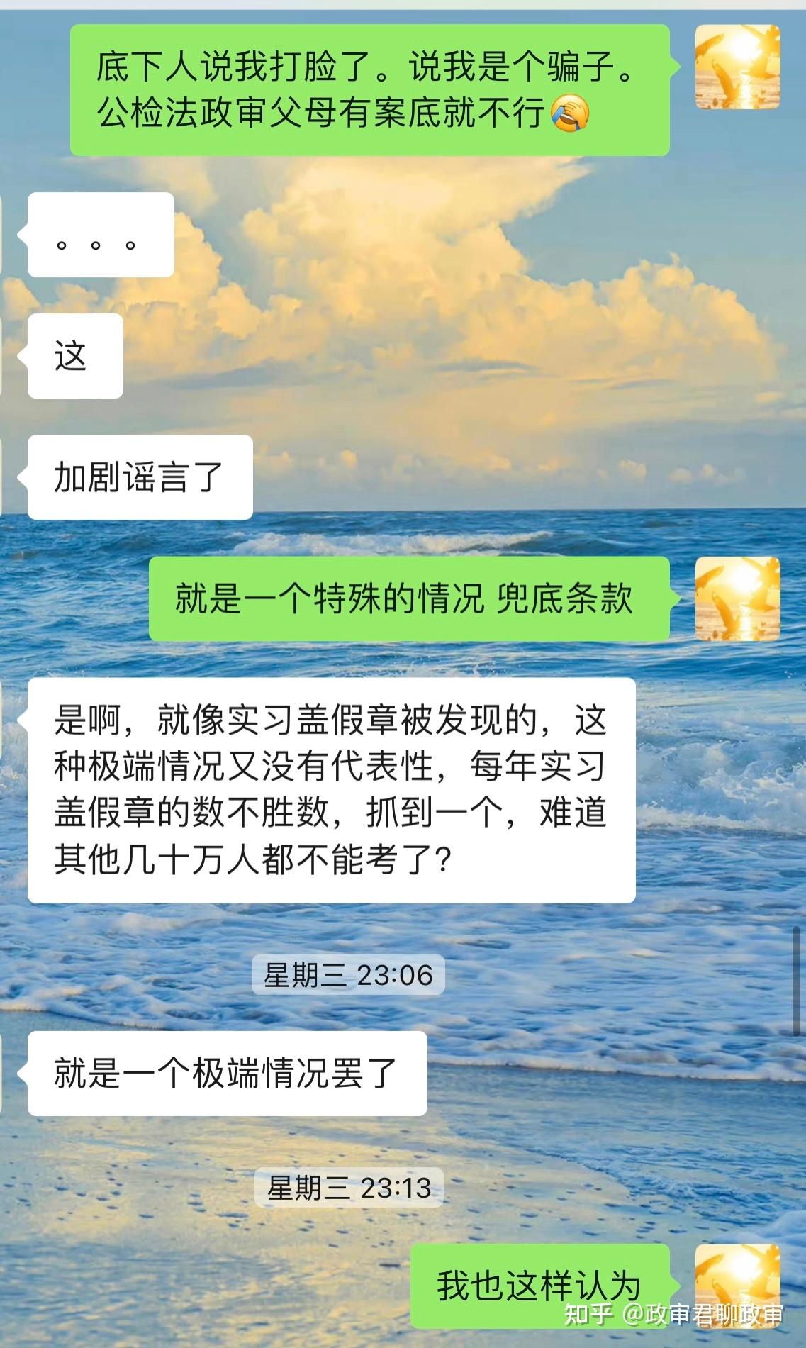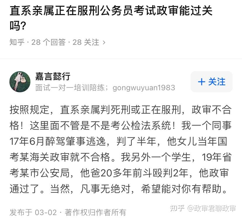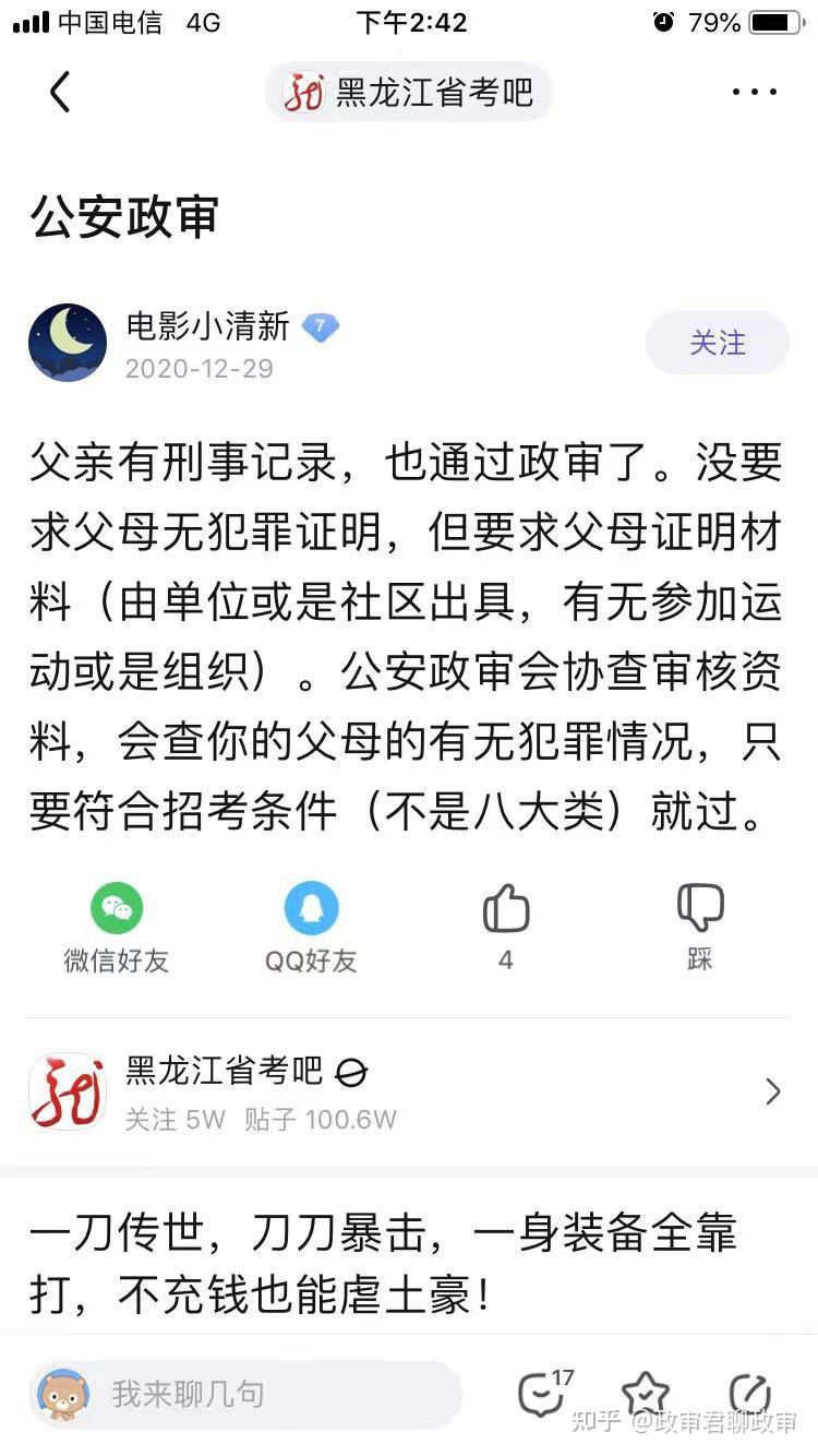 再说一下,那些心态不正。公考考了好几次考不上,或者考上了在单位受气,没有认真研究过政审的可怜虫们。别总拿兜底条款说事儿,别觉着一个兜底条款,别人父母有案底自己的没有我就高人一等了!这不是大清朝,不搞连坐!父母有案底的也保证心态,你们和父母没案底的人在政治上基本一致。