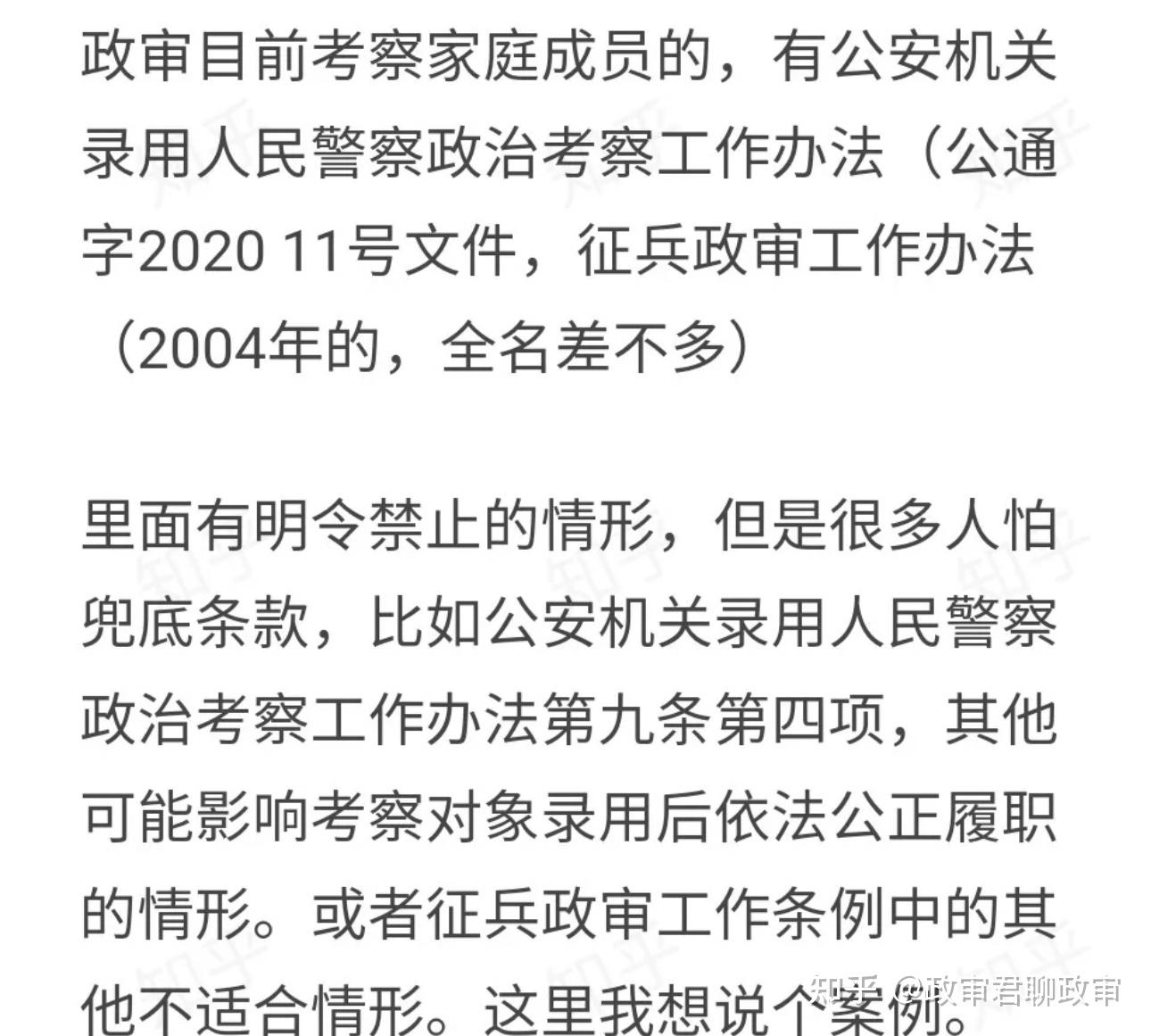 我们可以看到,单单从量化标准的角度讲,征兵和军队文职以及入党政审其实强度没有公安那么大。军队文职、征兵和入党政审的量化标准是:只要你的直系亲属不是政治问题,就不会影响到你的政审。
