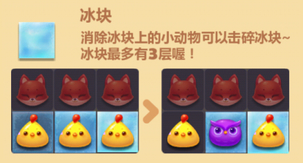 在一定步数内,只要消除的目标数达到关卡要求目标(关卡中左上角目标)即可过关;消除的目标可能包括:冰块、雪块、目标小动物、直线特效、爆破特效、魔力鸟特效等。