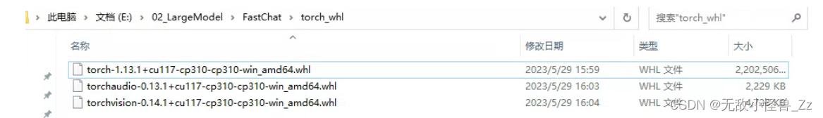 在FastChat新建一个torch_whl文件夹,把下载好的三个.whl文件存放进去,如图: