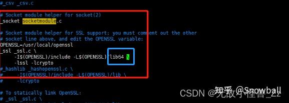 把下面5句代码的注释取消,还有两个地方的路径要修改。 - OPENSSL后面的路径改成你自己的openssl目录,我的是/urs/local/openssl,这里原本是OPENSSL=/path/to/openssl/directory。 - 二是蓝色框里面的要改成lib64,其它的不要动保存。我的openssl版本是3.0.5