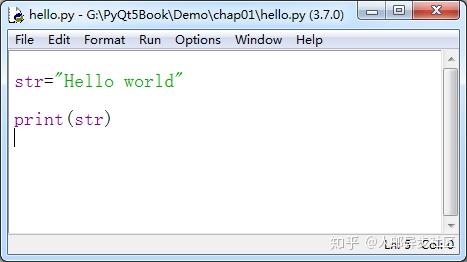 在图1-3窗口的“File”菜单下,点击“New File”,可以打开一个文件编辑器,在这个编辑器里可以编写Python程序,然后保存为后缀为“.py”的文件。例如,在图1-4的窗口中简单地输入了两行语句,然后保存为文件hello.py。