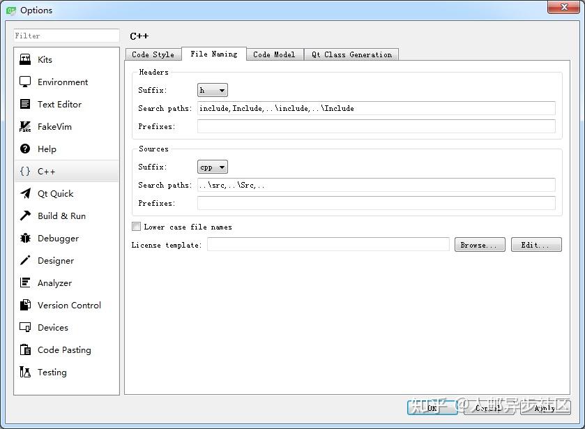 本书对使用的Qt Creator做了一些设置:一是将界面语言设置为英语,因为初始的汉语界面中某些词汇翻译得并不恰当,使用英语界面会更准确一些;二是设置文件命名规则,取消默认的全小写命名文件规则。