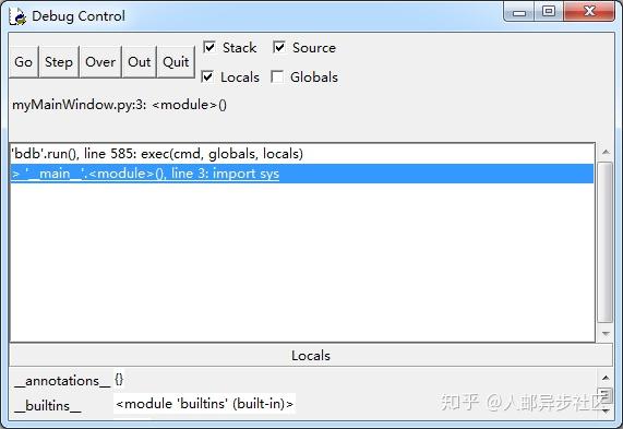 IDLE也具有程序调试功能。在文件编辑器中打开需要调试的源程序文件,通过鼠标右键快捷菜单在当前行设置或取消断点。在IDLE交互环境中,点击“Debug”→“Debugger”菜单项,出现如图1-5所示的调试控制窗口。按F5开始运行程序后,就进入调试状态。在调试状态下,使用图1-5窗口上的“Go”“Step”“Over”等按钮进行程序调试。程序调试的方法与一般IDE的程序调试方法类似,这里就不详细介绍了。