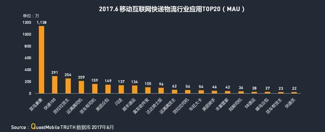截至2017年6月,移动互联网快递物流行业MAU TOP20 APP中,菜鸟裹裹MAU最高达1,138万,是第2名近4倍;