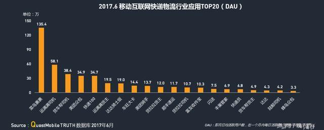 2017年6月,移动互联网快递物流行业月日均活跃用户规模TOP20 APP中,菜鸟裹裹DAU最高达135.4万;