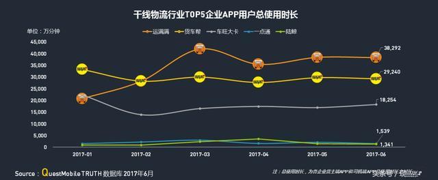 截至2017年6月,干线物流行业中,运满满的用户总使用时长约为3.8亿分钟,货车帮缓慢回落至2.9亿分钟,排在第二位;