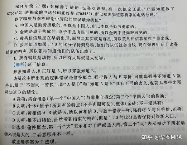命题方向二、偷换概念的逻辑错误。这类题一般是将一些看似一样的概念进行偷换,实际上改变了概念的修饰语、适用范围、所指对象等具体内涵。在这里需要区分集合概念和非集合概念。典型例题如2014年第27题: