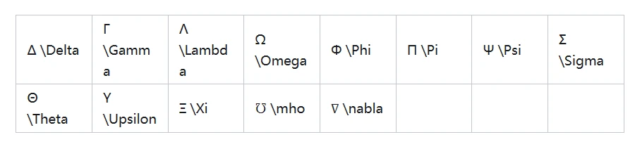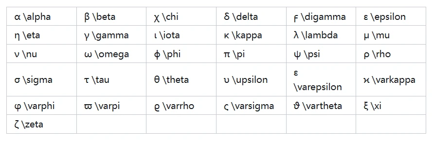 这些字母,前面应添加 ‘ \ ’ 并添加相应的文本,例如上文的 α 则使用‘\alpha’来表示,更多字母见下面表格。