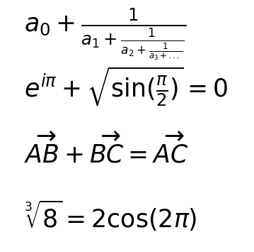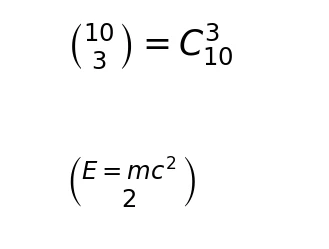 分数使用 ‘\frac{}{}’, 二项式使用 ‘\binom{}{}’,叠式数字使用‘\genfrac{}{}{}{}...’。