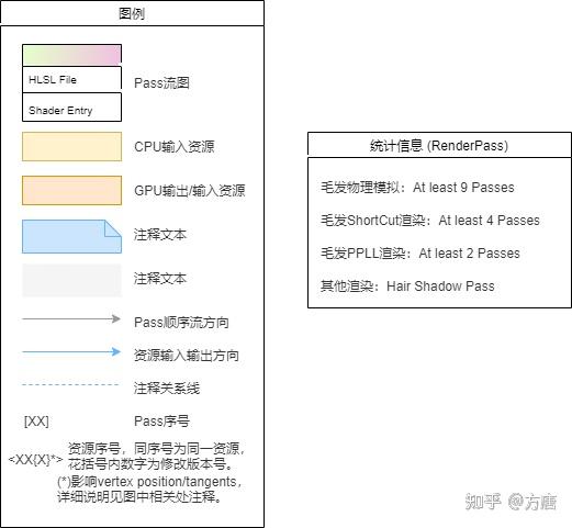 针对整个场景中只有1个头发模型和1个角色模型/头发附着体模型的场景,头发的物理模拟需要9个Passes,渲染根据选择的半透明混合算法的不同,分别需要4个Passes或2个Passes,除此之外,场景中每个灯源产生的阴影要带上头发的影响,还需要独立的Pass给头发做全局阴影。假设一个最简单的头发场景,只有1个灯源且仅往地面这一个面的方向上投射阴影,加上一个简单的ForwardPBR和ToneMapping,一个带头发的最简单的场景至少需要17个Passes(ShortCut)或15个Passes(PPLL)(即: 9(物理模拟) + 4(渲染ShortCut) 或 2(渲染PPLL) + 1(普通模型阴影) + 1(头发模型阴影) + 1(PBR) + 1(ToneMapping) )。