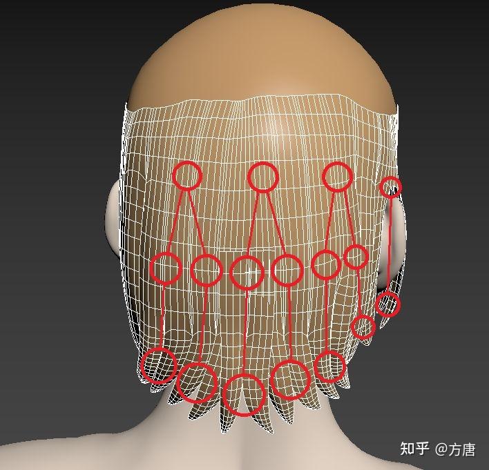 针对低性能手机端或者要求低功耗、毛发物理计算的精确度需求非常低的场景,有一种极简廉价的等效替代方案。该方案的毛发物理计算方法既不是基于每一根发丝的,也不是基于每一小缕、每一小撮、每一小束的,而是类似于在这一大把毛发上加上一些骨骼,然后把这一大把毛发等效成一系列刚体球,然后在这些球间添加弹簧质点约束,采用通用物理引擎直接进行计算,计算结果驱动毛发的骨骼动画。这种极简的替代方案,可以将一个角色的披头的长发等效成几个刚体球,如下图所示,计算时实际上只有几个刚体球的计算,开销非常小。弊端也非常明显,只能模拟简单的发型,而且物理模拟效果不理想。