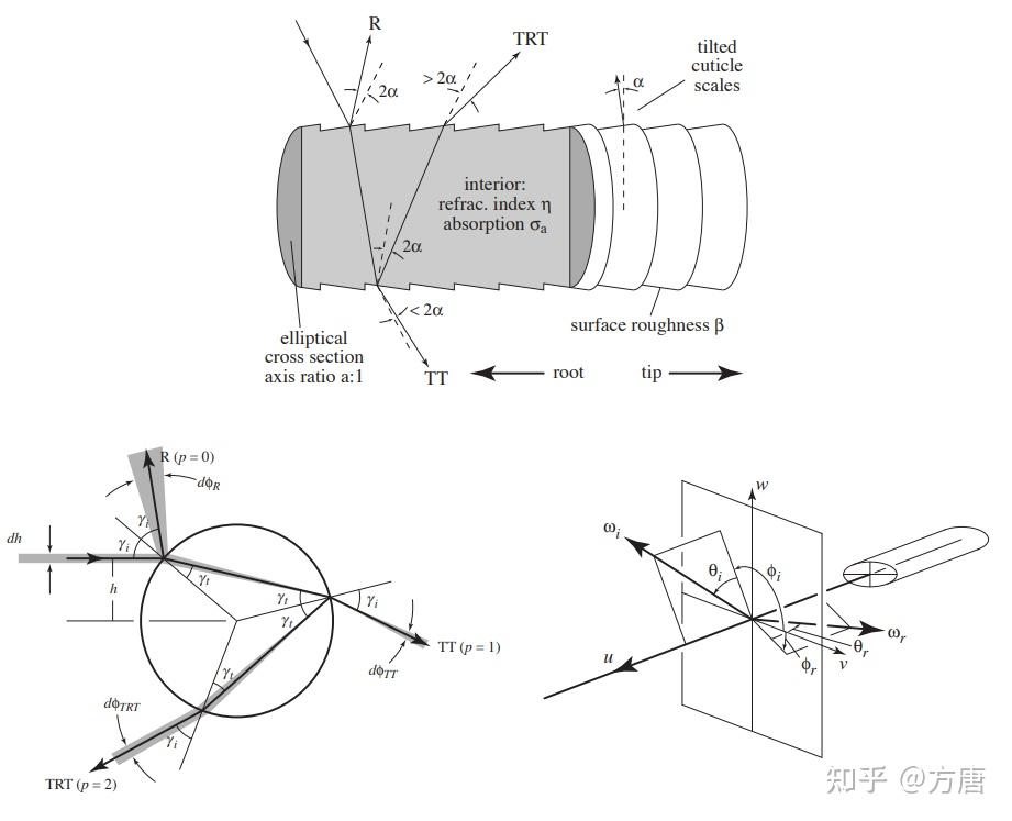 后续的算法基本都是基于Kajiya和Marschner的改进和补充。Kajiya光照模型给我们提供了一套物理不正确、但计算速度快的廉价方案,而Marschner是基于真实的发丝物理结构,进行测算后建模形成的光照模型,物理真实性更高,但计算量相比起来也会大些。