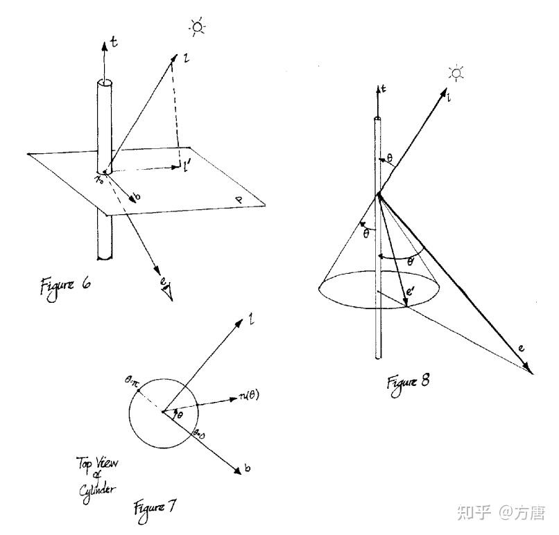 毛发光照模型中的Kajiya算法,是一个简单的不符合物理真实的光照模型,但它也足够简单、计算量小。它首先假设了发丝是一个光滑的圆柱体,然后再应用上各项异性(对入射光进行一定角度的偏移)来模拟角质层的鳞片样状带来的影响。Kajiya算法只考虑反射带来的影响,不考虑透射和散射的影响。如下图所示:在计算光的specular分量时,Kajiya算法类似于直接计算镜面反射,但为了加入各项异性的影响,引入了一个小角度的光偏移,该光偏移的角度值是一个正弦函数变化的值,这样我们就能模拟实现头发上的天使环;而在计算光的diffuse分量时,迎着光方向的发丝在0到180度范围内做积分,这样就得到了漫反射值。