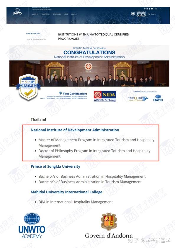 2018年,NIDA GSTM的硕士和博士课程获得了联合国世界旅游组织教育质量(UNWTO-TedQual) 国际认证。