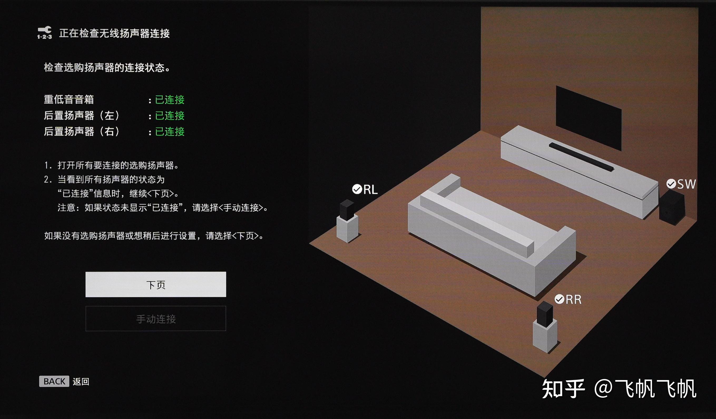 A7000主机接上电视开机,把所有的音箱接上电源,低音炮与后环绕按下电源开关再按LINK配网按键,此时绿灯闪烁,然后进入电视上A7000的设置页面中。