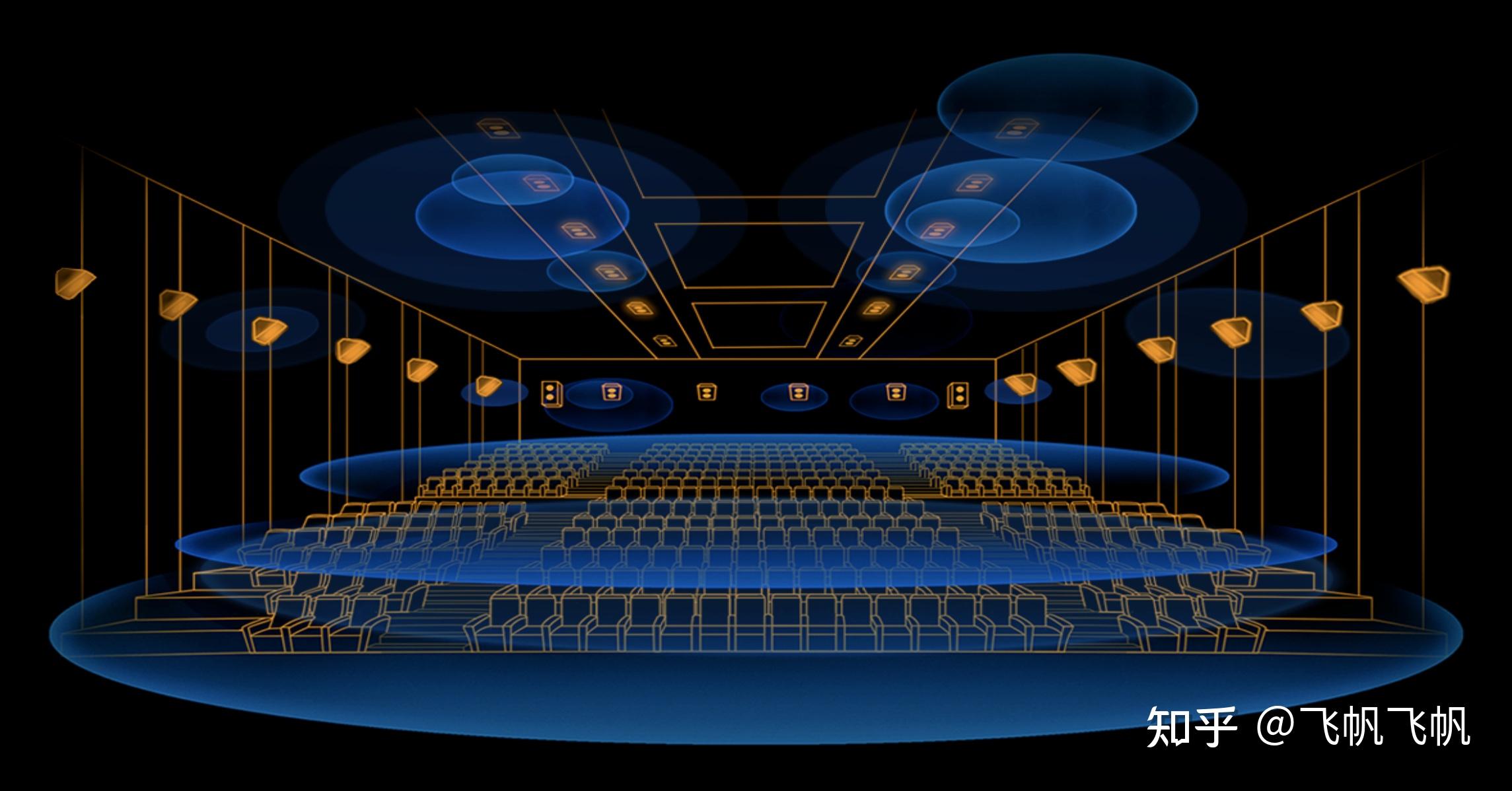 我们在电影院,要实现360度环绕的声场,是通过在影厅的四面(包括幕布后面也有音箱)与天花板布置音箱,这是通过物理方式实现的。