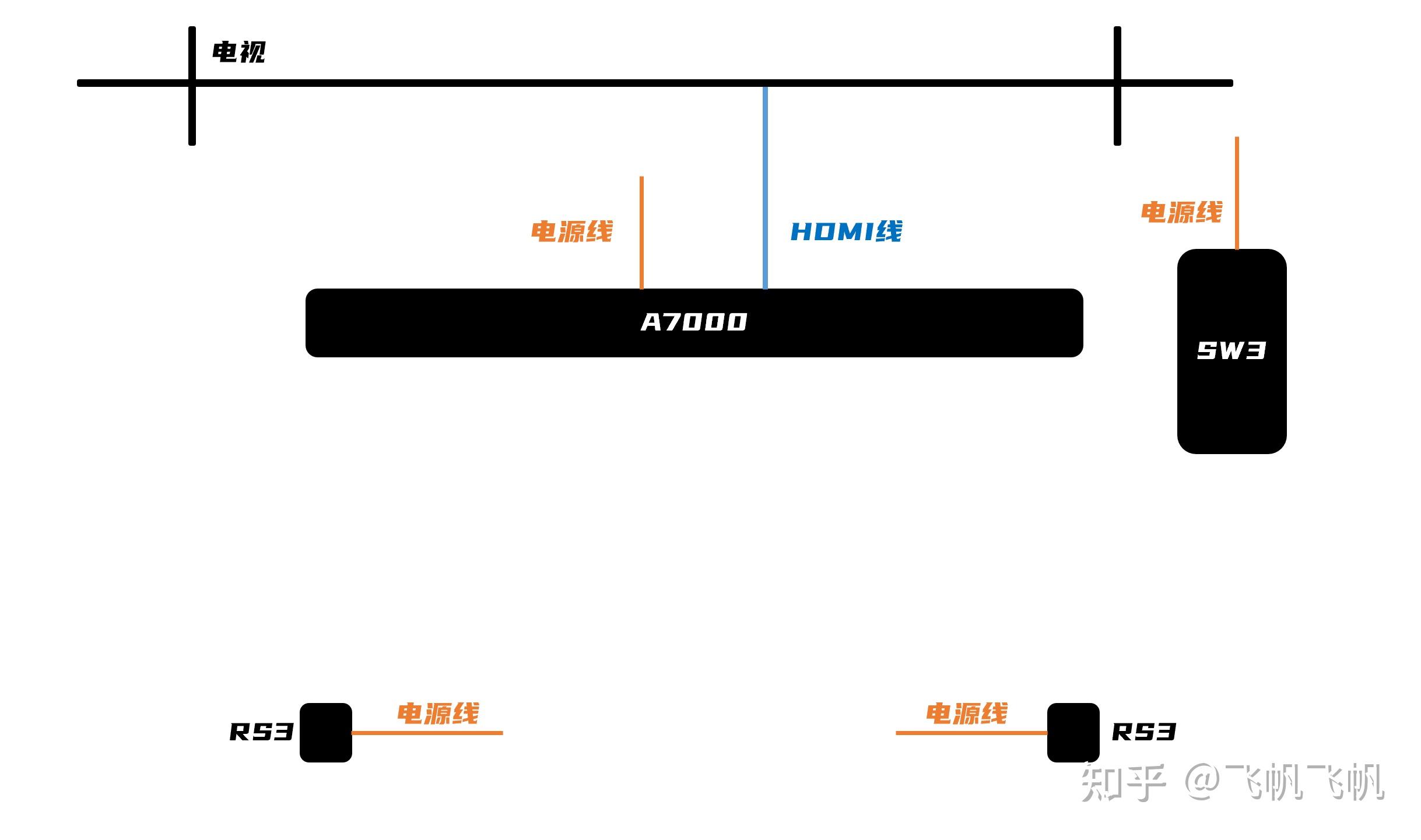 我简单画一个图,全套音响必须连接的线就是4根电源线,而HDMI线就看你连接多少个设备,那、一些精装修/已经装修的用户,就、也能实现自己的环绕全景声啦。