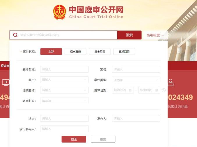 2、直接点击高级检索,输入相关的案件信息,可以直接查找到您所想观看的直播案件。