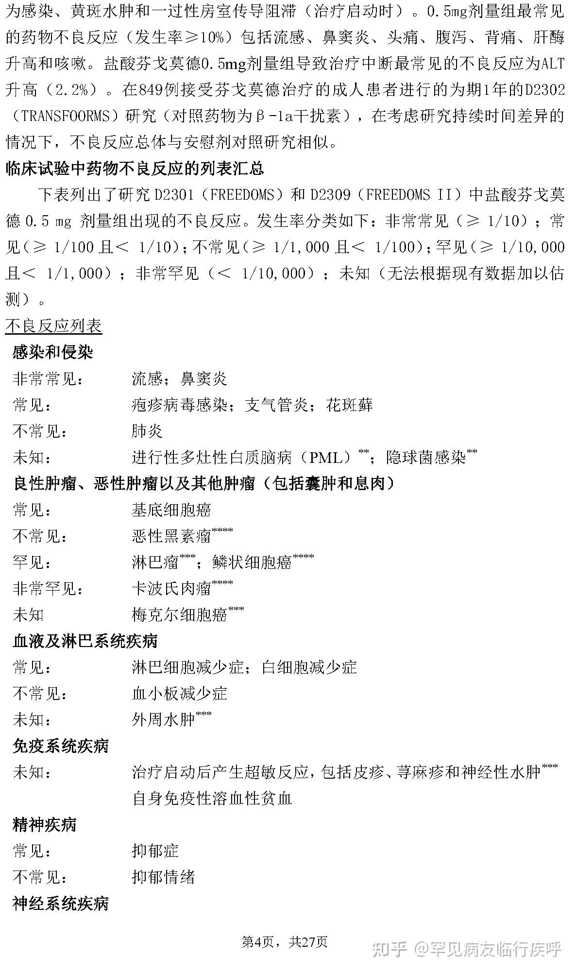 为感染、黄斑水肿和一过性房室传导阻滞(治疗启动时)。0.5mg剂量组最常见的药物不良反应(发生率≥10%)包括流感、鼻窦炎、头痛、腹泻、背痛、肝酶升高和咳嗽。盐酸芬戈莫德0.5mg剂量组导致治疗中断最常见的不良反应为ALT升高(2.2%)。在849例接受芬戈莫德治疗的成人患者进行的为期1年的D2302(TRANSFOORMS)研究(对照药物为β-1a干扰素),在考虑研究持续时间差异的情况下,不良反应总体与安慰剂对照研究相似。