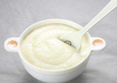 3、搅拌时,汤匙应稍微倾斜并朝一个方向搅拌。应该用勺子碾碎结块颗粒。理想的米糊应该是用勺子舀起来倒下的时候能呈炼奶状。 如果呈水滴状流下的话就太稀了,如果很难留下来就说明太稠了。