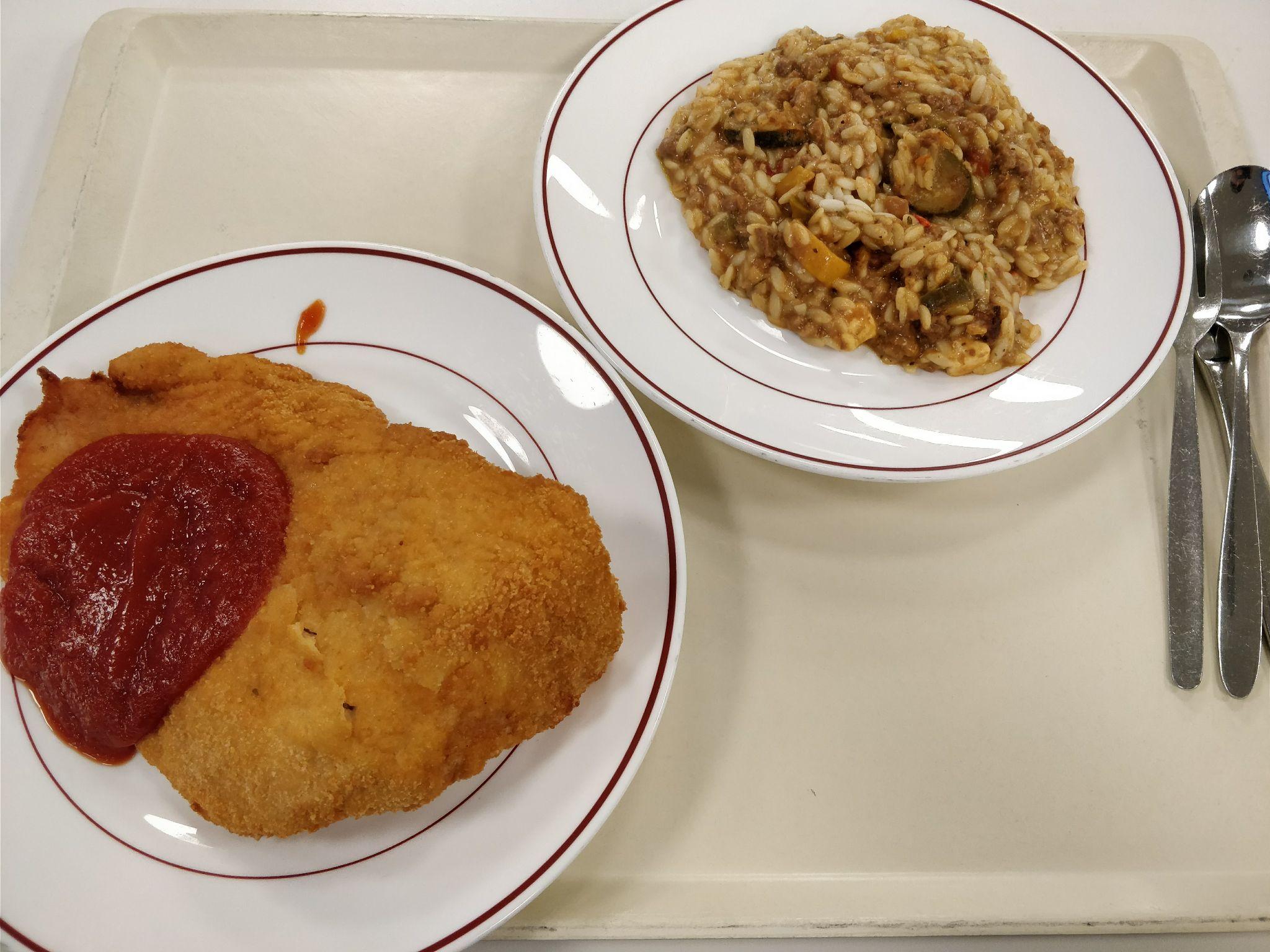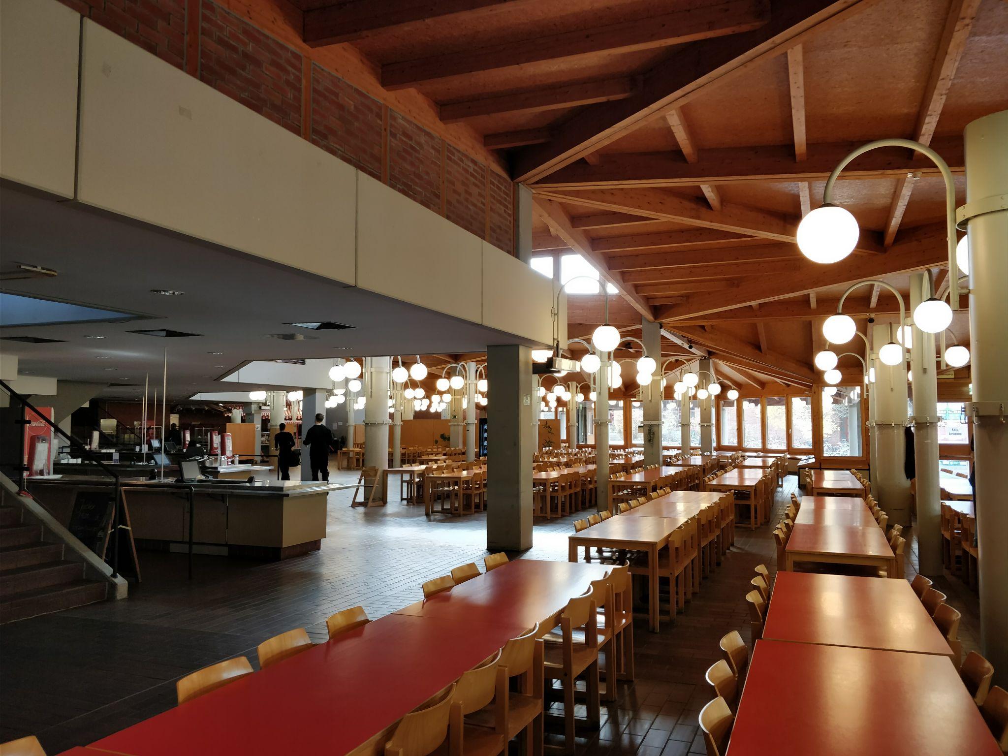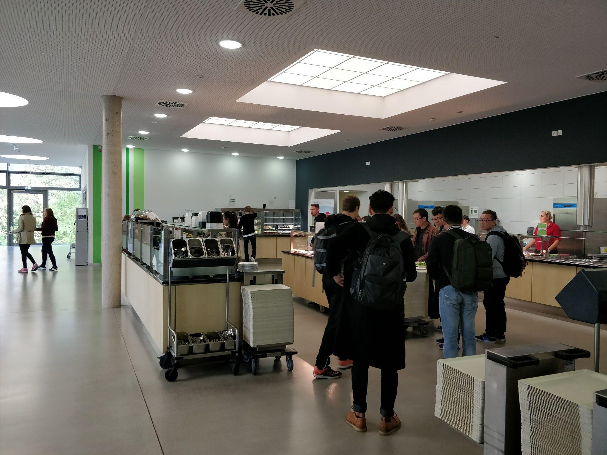 吃:学校有两个食堂,一个Hauptmensa主食堂,还有个外墙绿色的小食堂,他们是连在一起的。主食堂只有在周一到周五的中午提供饭菜,而小食堂是周一到周五的中午和晚上都有饭吃,周六的中午也可以去吃。主食堂的菜经常会换新,样式比较多。小食堂基本上就那么几种菜,变化不多。小食堂有烤肠、炸猪排、炸薯条、意面、蔬菜沙拉什么的。