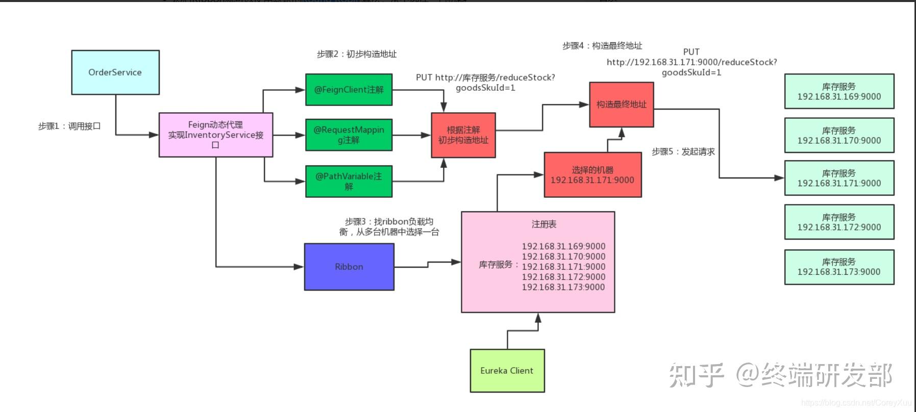 首先Ribbon会从 Eureka Client里面获取到对应的服务注册表,也就知道了所有的服务都部署在了那台机器上,在监听哪些端口,