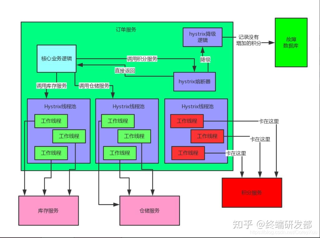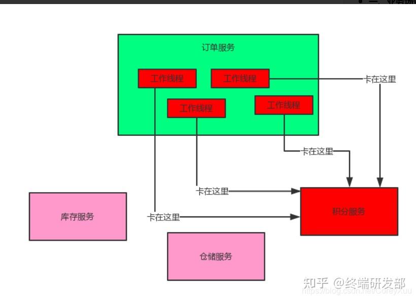 在微服务架构里,一个系统会有多个服务, 以本文的业务场景为例:订单服务在一个业务流程里需要调用三个服务,现在假设订单服务自己最多只有100个线程可以处理请求然后呢,积分服务不幸的挂了,每次订单服务调用积分服务的时候,都会卡住几秒钟,然后抛出—个超时异常。