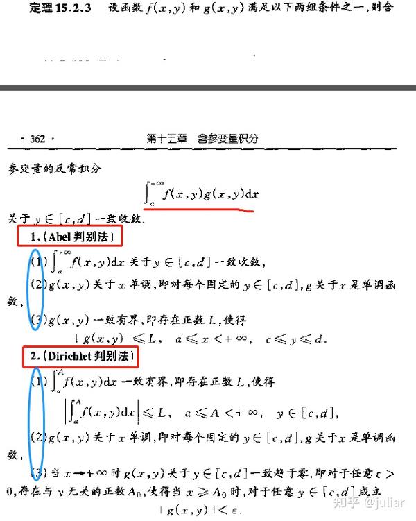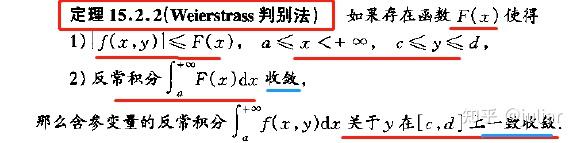 Weierstrass判别法:若被一个收敛的反常积分从被积函数上限制住,则其本身一致收敛。