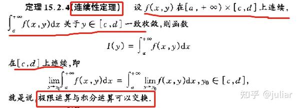 连续性定理 : f(x,y) 连续+ I(y) 一致收敛 => I(y) 连续 ;