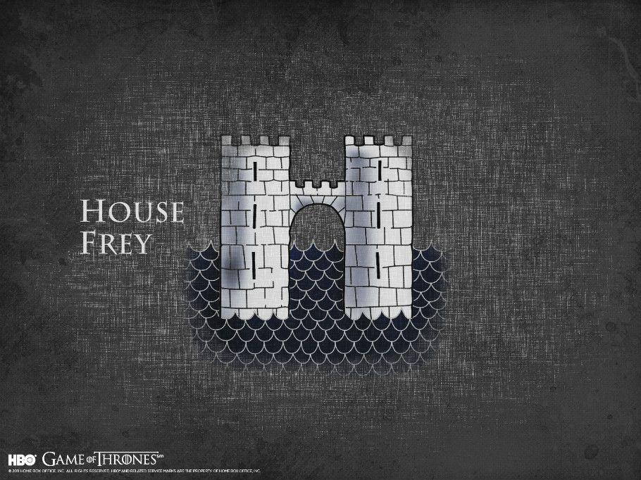 佛雷家族是一支年轻的家族,距今六百年前,当风暴王统治河间地的时候,他们才获得封地。那是绿叉河两岸一块富饶的地区,也是绿叉河在汇入三叉戟河前唯一的渡口。聪明的佛雷先祖意识到了这一点,于是他花费三代人的时间在绿叉河上盖起了一座大桥,并向获取便利的过往商旅收税。佛雷家族由此发迹。随着财富的增长,他们的木桥变成了石桥,桥中央也出现了高耸的卫河塔,他们还在石桥两端建造了坚固的城堡。城堡保护着石桥,石桥则将两座城堡连为一体。这个庞大的工事被称作孪河城,其形象则成了佛雷家族的家徽——灰色底面上的蔚蓝双塔。
