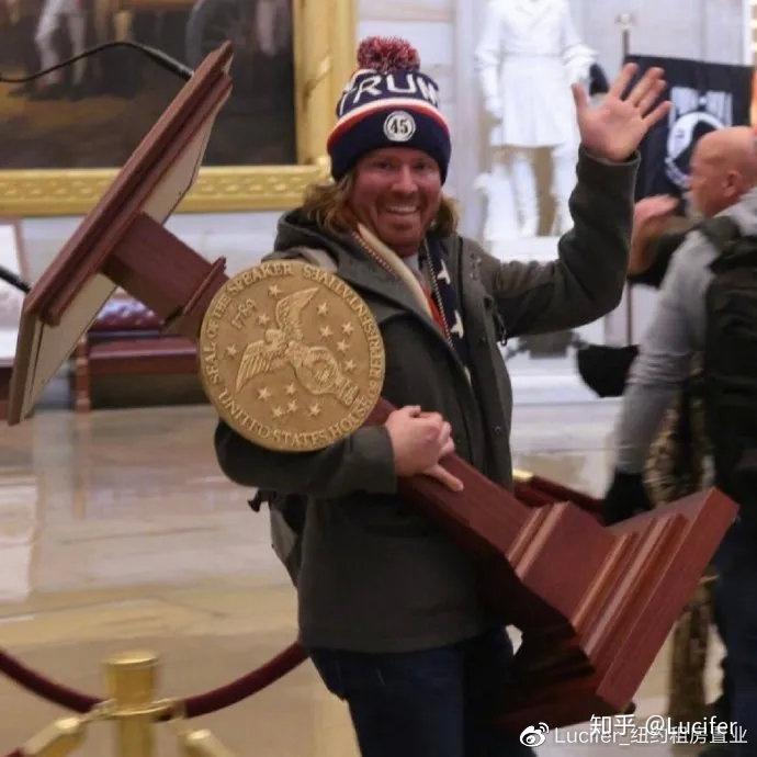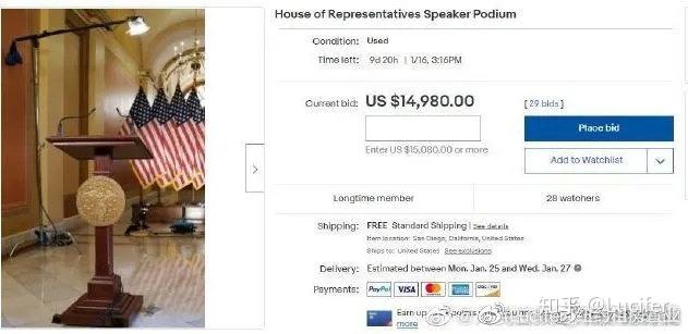 暴乱期间,一名特朗普支持者面带微笑,抱走了众议院院长佩洛西的讲话台,下落不明。此后,网传该讲话台被放在eBay上拍卖,网友的出价一度高达近10万美元。目前该物品已被eBay下架。
