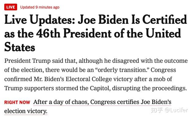 最终,今日凌晨, 国会结束拜登的总统认证程序, 正式宣布拜登为美国第46届总统 。