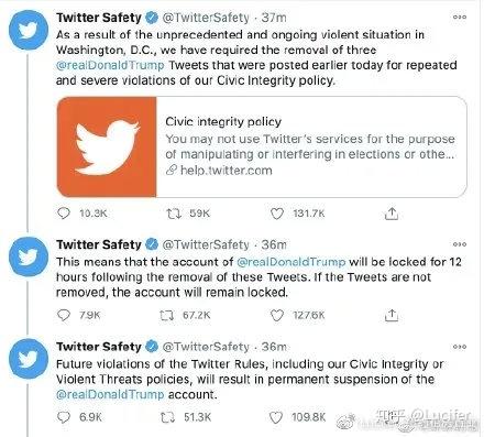 彭博1月7日消息,推特安全发布声明,表示将冻结特朗普的账号12小时, 若未来出现违反规定的情况,推特或永久冻结特朗普的账号。