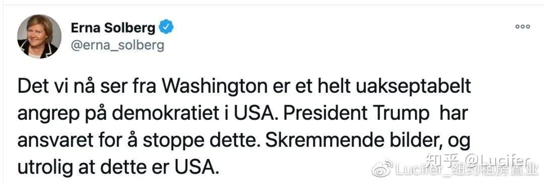 挪威 首相索尔伯格(Erna Solberg)在推特上发帖称:“这是对美国民主的不可接受的攻击……可怕的画面,令人难以置信的是,这一切发生在美国。”