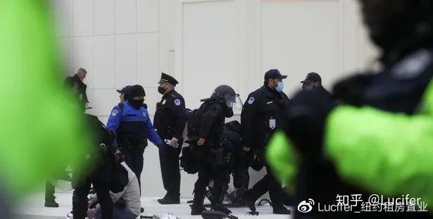 特朗普支持者在国会大厦外同武装的国民警卫队对峙、叫骂,有2名示威者被警察带翻在地拖行。有示威者“挡道”被警察一掌推开。