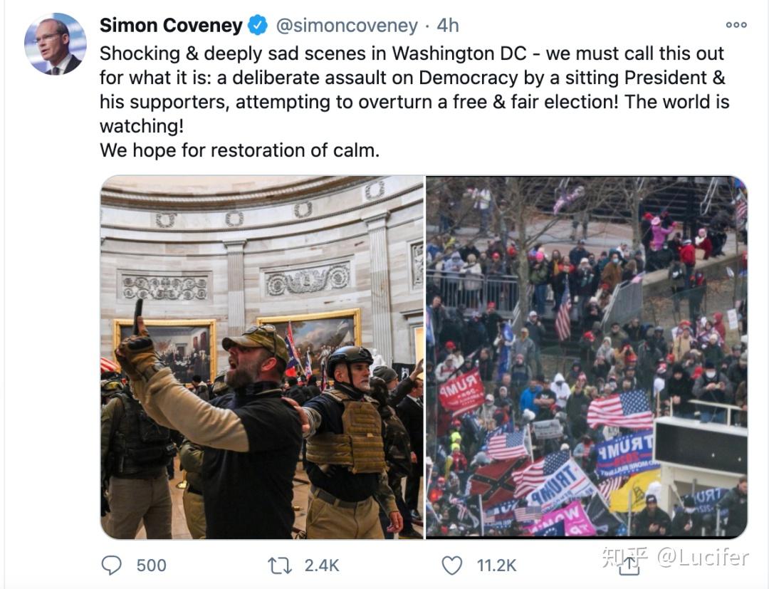 爱尔兰 外交部长柯文尼(Simon Coveney)称,华盛顿的这一幕是“现任总统及其支持者对民主的蓄意攻击,企图推翻自由公正的选举!”