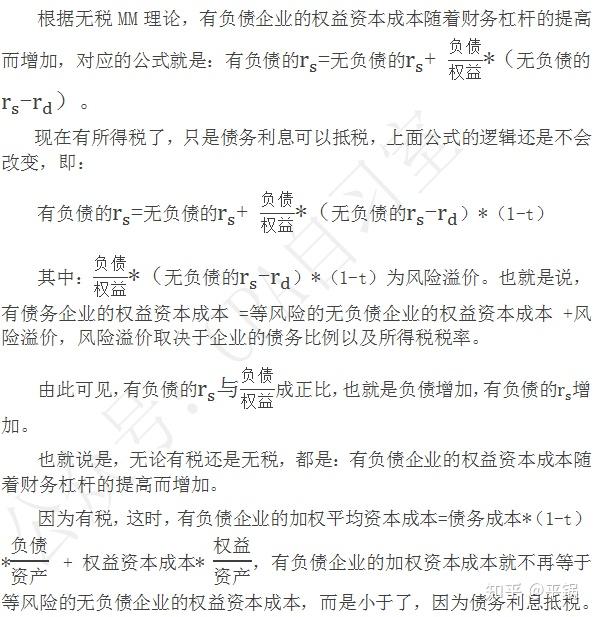观点二:有负债企业的权益资本成本等于等风险的无负债企业的权益资本成本风险溢价,风险溢价取决于企业的债务比例以及所得税税率。