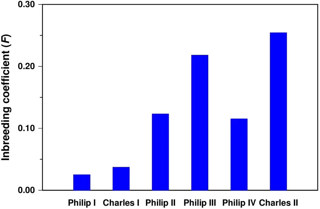 到查尔斯二世时,他的近交系数就已经高达0.254了。