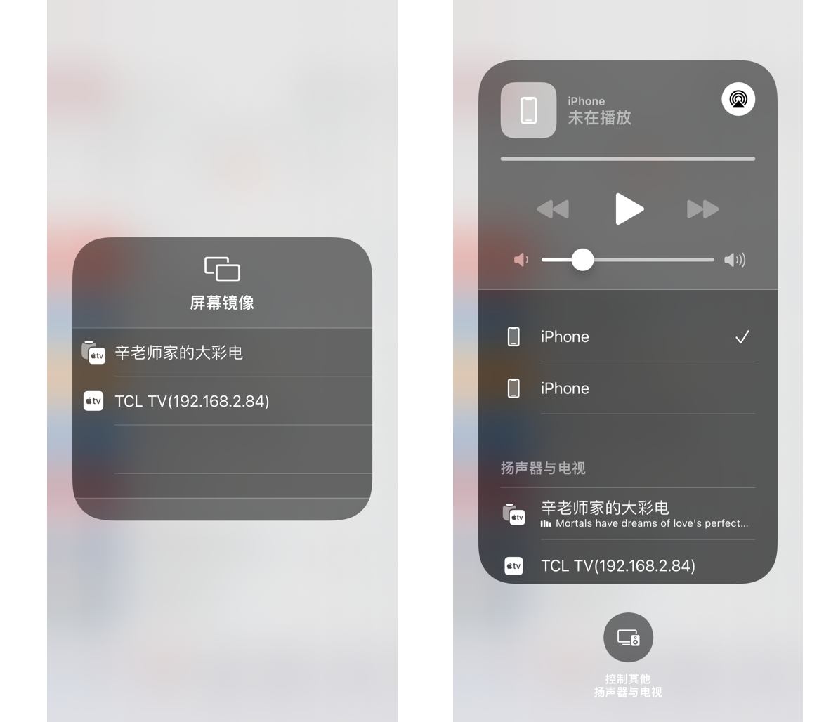 屏幕镜像会自动把屏幕投到Apple TV,音频投送到HomePods