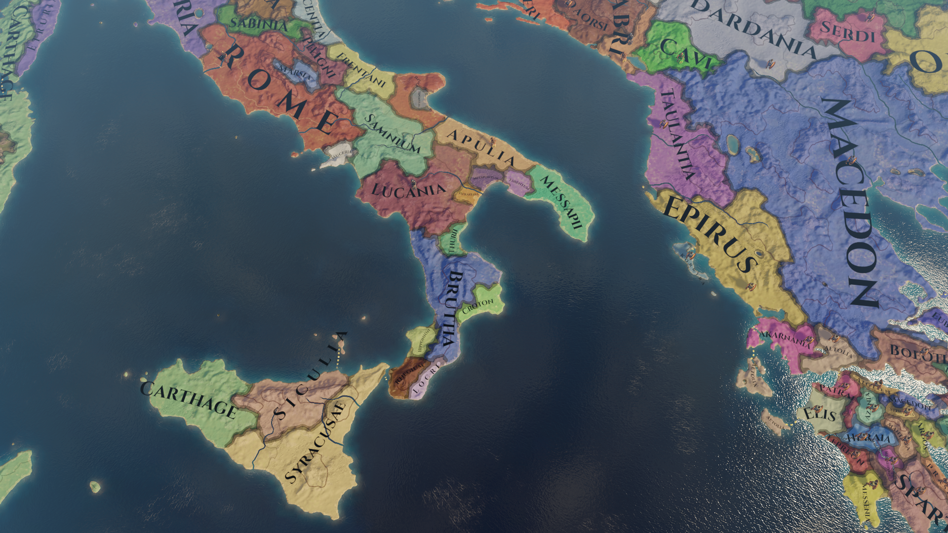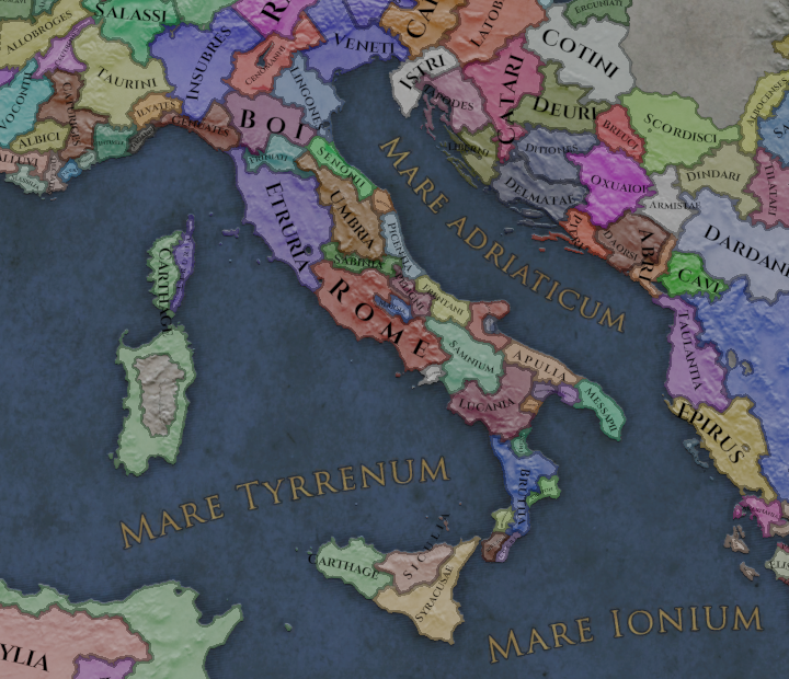 At the time of our start date Southern Italy is a divided region. Also known as "Magna Graecia" It is home to a number of Greek city states, many who have ties to their former homeland, and to the great Hellenic power of Syracuse. The region is also home to a number of large tribal federations such as the Bruttian and Lucanian Leagues.
