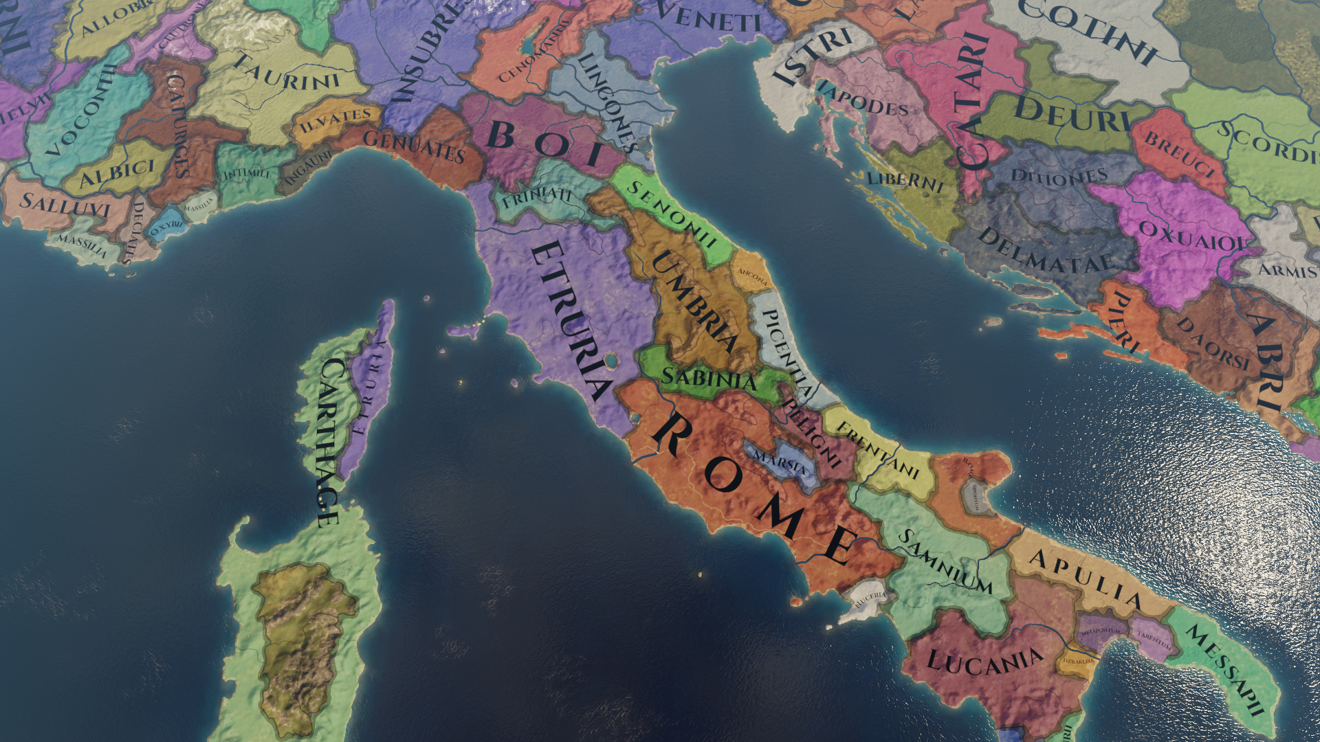 Previously we have talked about how we have approached researching the map. In this diary I will instead focus on what our map actually looks like, and the situation in Italy at our start date, 304 BC. This date was chosen after long consideration and we hope that it will provide an as interesting setting for a game that spans the main expansive phase of Rome’s existence (as well as many other things, but we will get to those later, in other diaries).